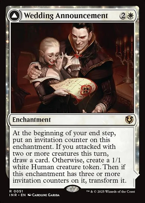 At the beginning of your end step, put an invitation counter on Wedding Announcement. If you attacked with two or more creatures this turn, draw a card. Otherwise, create a 1/1 white Human creature token. Then if Wedding Announcement has three or more invitation counters on it, transform it.