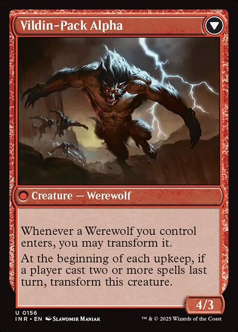 At the beginning of each upkeep, if a player cast two or more spells last turn, transform Vildin-Pack Alpha.