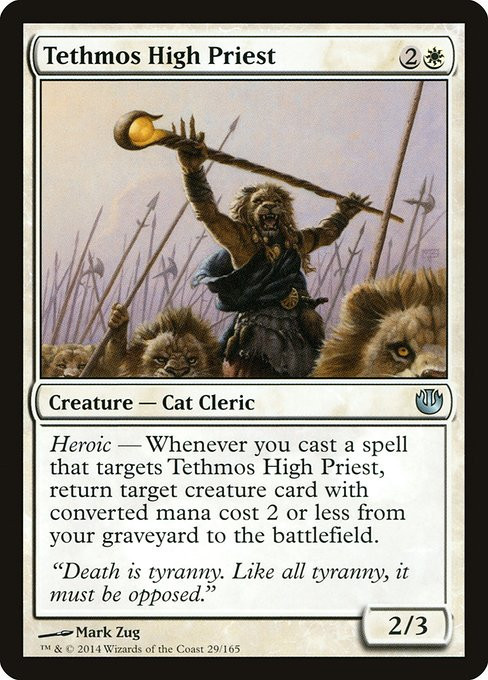 Heroic — Whenever you cast a spell that targets Tethmos High Priest, return target creature card with mana value 2 or less from your graveyard to the battlefield.