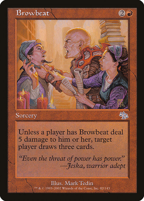 Any player may have Browbeat deal 5 damage to them. If no one does, target player draws three cards.