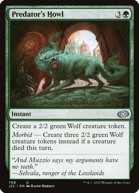 Morbid — Create three 2/2 green Wolf creature tokens instead if a creature died this turn.