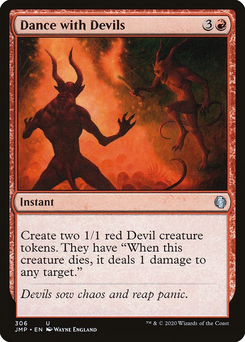 Create two 1/1 red Devil creature tokens. They have "When this creature dies, it deals 1 damage to any target."