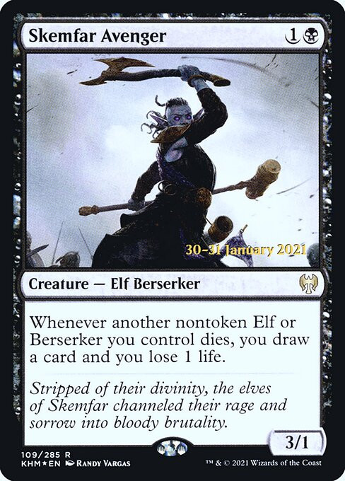 Whenever another nontoken Elf or Berserker you control dies, you draw a card and you lose 1 life.