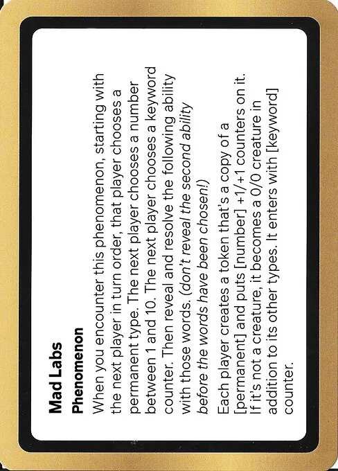 When you encounter this phenomenon, starting with the next player in turn order, that player chooses a permanent type. The next player chooses a number between 1 and 10. The next player chooses a keyword counter. Then reveal and resolve the following ability with those words. (don't reveal the second ability before the words have been chosen!)