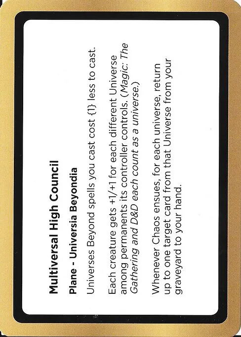 Universes Beyond spells you cast cost less to cast. Each creature gets +1/+1 for each different Universe among permanents its controller controls. (Magic: The Gathering and D&D each count as a universe.) Whenever Chaos ensues, for each universe, return up to one target card from that Universe from your graveyard to your hand.