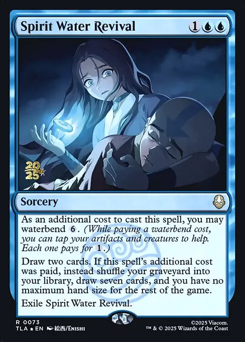 As an additional cost to cast this spell, you may waterbend . (While paying a waterbend cost, you can tap your artifacts and creatures to help. Each one pays for .) Draw two cards. If this spell's additional cost was paid, instead shuffle your graveyard into your library, draw seven cards, and you have no maximum hand size for the rest of the game. Exile Spirit Water Revival.