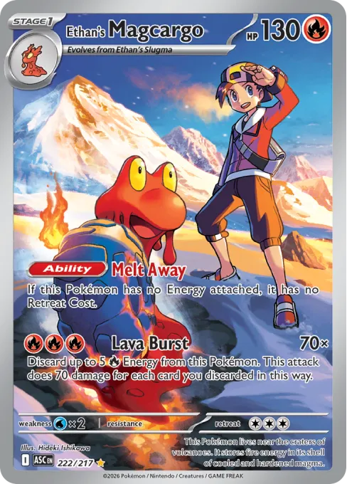 This Pokémon lives near the craters of volcanoes. It stores fire energy in its shell of cooled and hardened magma.