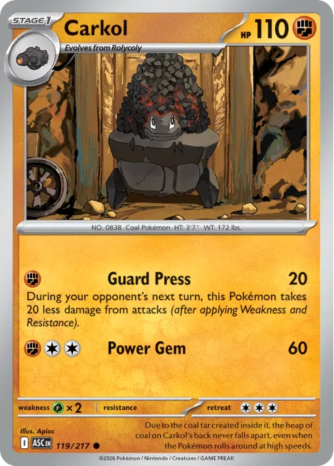 Due to the coal tar created inside it, the heap of coal on Carkol’s back never falls apart, even when the Pokémon rolls around at high speeds.