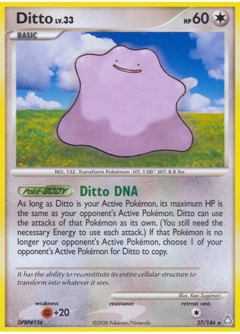 As long as Ditto is your Active Pokémon, its maximum HP is the same as your opponent's Active Pokémon. Ditto can use the attacks of that Pokémon as its own. (You still need the necessary Energy to use each attack.) If that Pokémon is no longer your opponent's Active Pokémon, choose 1 of your opponent's Active Pokémon for Ditto to copy.