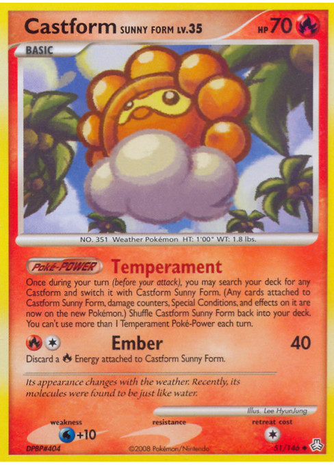 Once during your turn (before your attack), you may search your deck for any Castform and switch it with Castform Sunny Form. (Any cards attached to Castform Sunny Form, damage counters, Special Conditions, and effects on it are now on the new Pokémon.) Shuffle Castform Sunny Form back into your deck. You can't use more than 1 Temperament Poké-Power each turn.