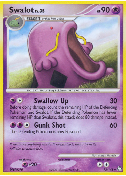 Before doing damage, count the remaining HP of the Defending Pokémon and Swalot. If the Defending Pokémon has fewer remaining HP than Swalot's, this attack does 80 damage instead.
