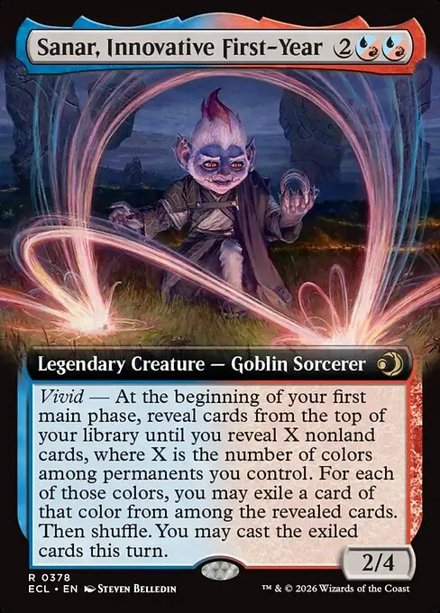Vivid — At the beginning of your first main phase, reveal cards from the top of your library until you reveal X nonland cards, where X is the number of colors among permanents you control. For each of those colors, you may exile a card of that color from among the revealed cards. Then shuffle. You may cast the exiled cards this turn.