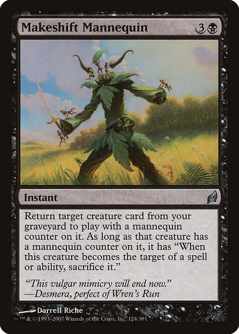 Return target creature card from your graveyard to the battlefield with a mannequin counter on it. For as long as that creature has a mannequin counter on it, it has "When this creature becomes the target of a spell or ability, sacrifice it."