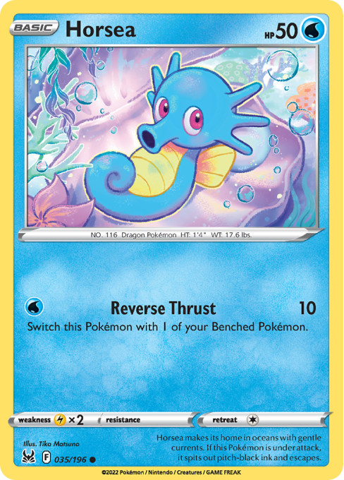 Horsea makes its home in oceans with gentle currents. If this Pokémon is under attack, it spits out pitch-black ink and escapes.