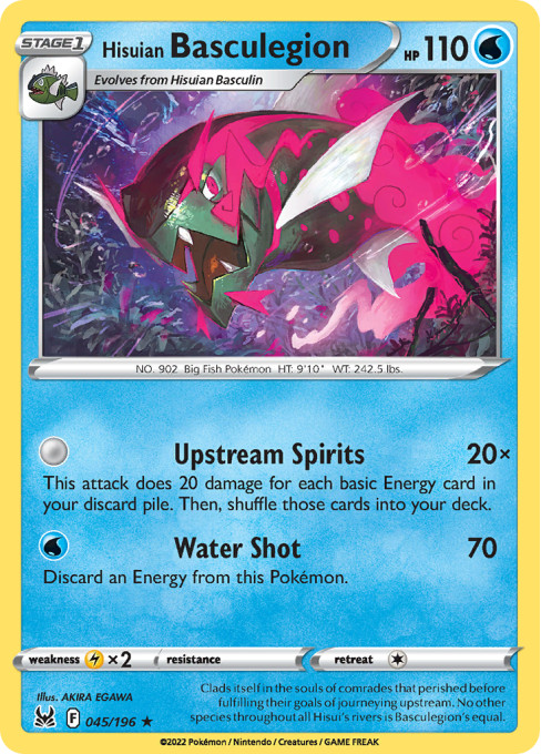 Clads itself in the souls of comrades that perished before fulfilling their goals of journeying upstream. No other species throughout all Hisui's rivers is Basculegion's equal.