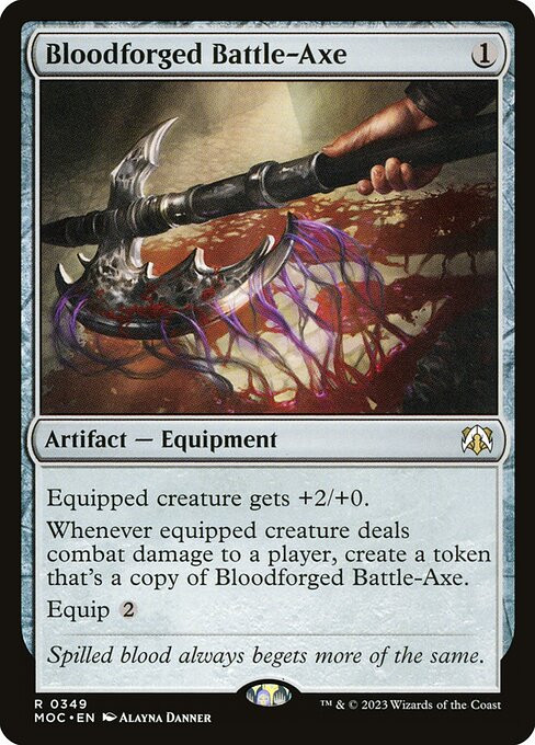 Whenever equipped creature deals combat damage to a player, create a token that's a copy of Bloodforged Battle-Axe.