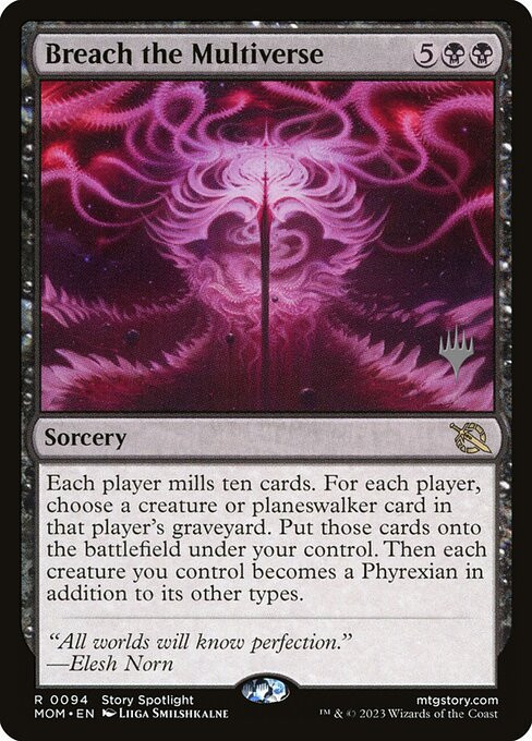 Each player mills ten cards. For each player, choose a creature or planeswalker card in that player's graveyard. Put those cards onto the battlefield under your control. Then each creature you control becomes a Phyrexian in addition to its other types.