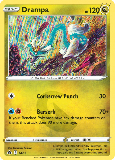 Drampa is a kind and friendly Pokémon—up until it's angered. When that happens, it stirs up a gale and flattens everything around.