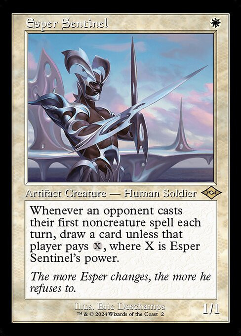 Whenever an opponent casts their first noncreature spell each turn, draw a card unless that player pays , where X is Esper Sentinel's power.