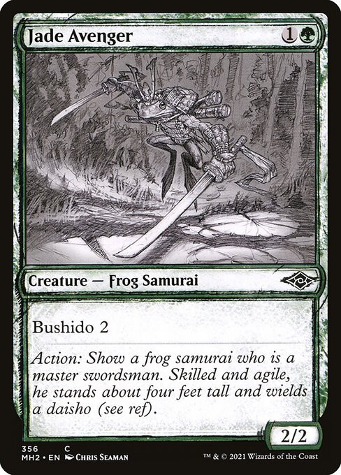 "Action: Show a frog samurai who is a master swordsman. Skilled and agile, he stands about four feet tall and wields a daisho (see ref)."
