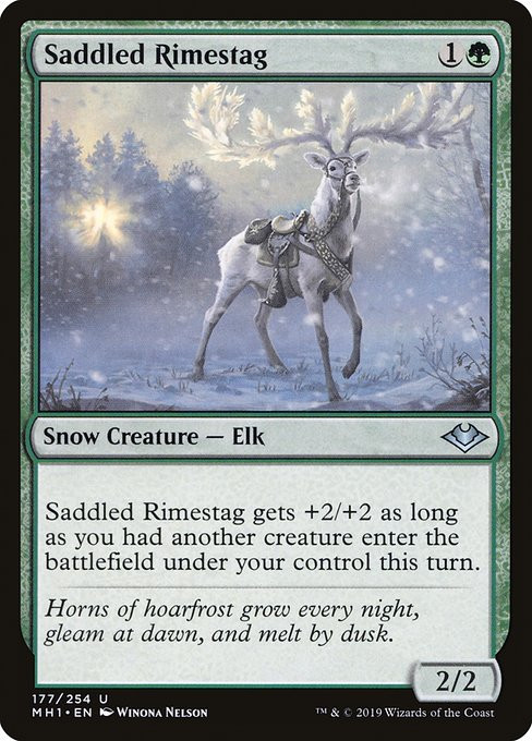 Saddled Rimestag gets +2/+2 as long as you had another creature enter the battlefield under your control this turn.