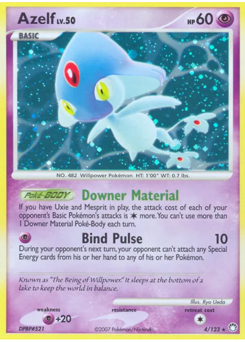 If you have Uxie and Mesprit in play, the attack cost of each of your opponent's Basic Pokémon's attacks is Colorless more. You can't use more than 1 Downer Material Poké-Body each turn.