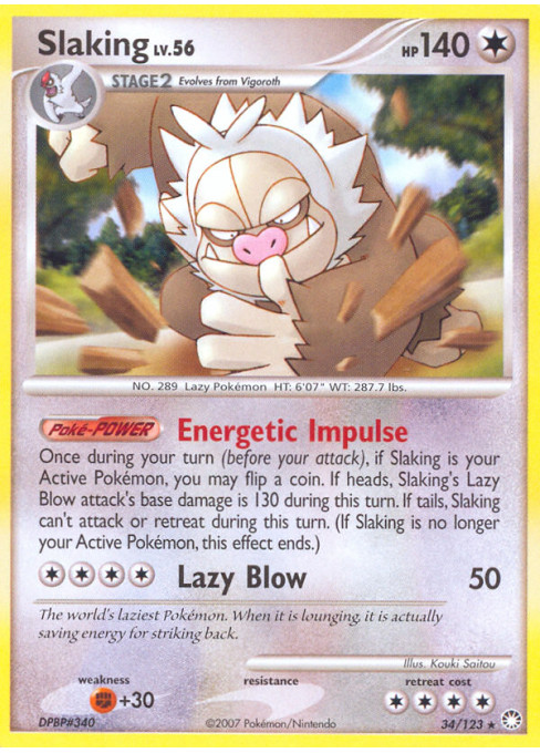 Once during your turn (before your attack), if Slaking is your Active Pokémon, you may flip a coin. If heads, Slaking's Lazy Blow attack's base damage is 130 during this turn. If tails, Slaking can't attack or retreat during this turn. (If Slaking is no longer your Active Pokémon, this effect ends.)