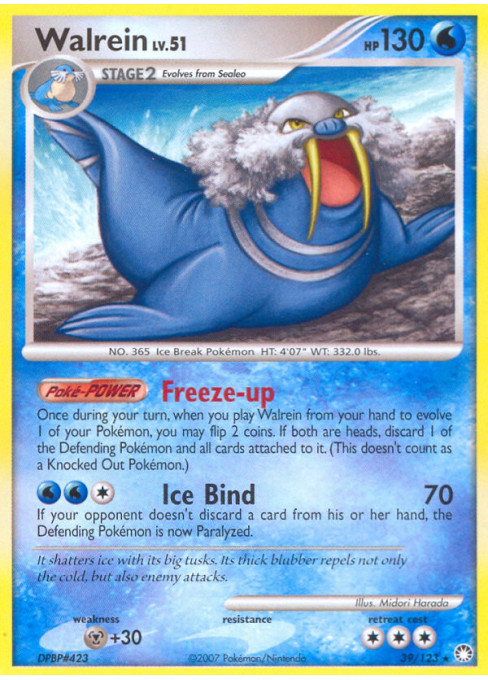 Once during your turn, when you play Walrein from your hand to evolve 1 of your Pokémon, you may flip 2 coins. If both are heads, discard 1 of the Defending Pokémon and all cards attached to it. (This doesn't count as a Knocked Out Pokémon.)