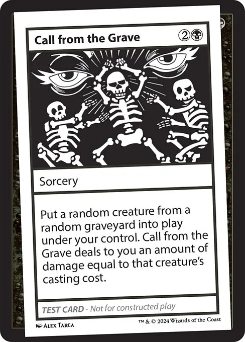 Put a random creature from a random graveyard into play under your control. Call from the Grave deals to you an amount of damage equal to that creature's casting cost.