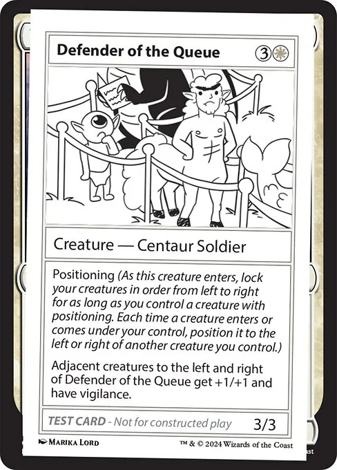 Positioning (As this creature enters, lock your creatures in order from left to right for as long as you control a creature with positioning. Each time a creature enters or comes under your control, position it to the left or right of another creature you control.) Adjacent creatures to the left and right of Defender of the Queue get +1/+1 and have vigilance.