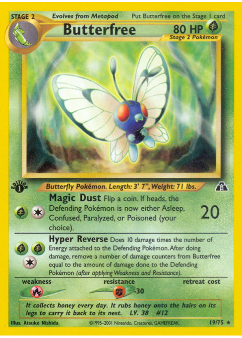 Does 10 damage times the number of Energy attached to the Defending Pokémon. After doing damage, remove a number of damage counters from Butterfree equal to the amount of damage done to the Defending Pokémon (after applying Weakness and Resistance).
