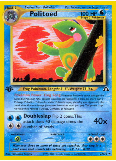 Whenever Politoed's attack damages the Defending Pokémon (after applying Weakness and Resistance), if there are more than 3 Poliwags, Poliwhirls, Poliwraths, and/or Politoeds in play (including your opponent's), that attack does 40 more damage (no matter how many heads you get). This power stops working while Politoed is Asleep, Confused, or Paralyzed.