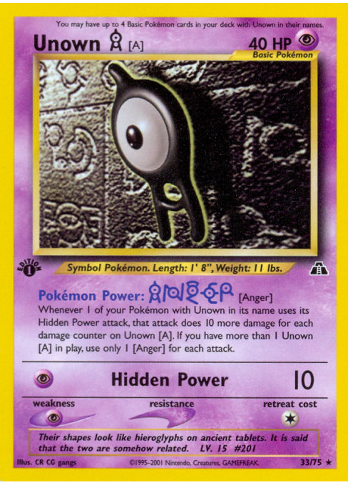 Whenever 1 of your Pokémon with Unown in its name uses its Hidden Power attack, that attack does 10 more damage for each damage counter on Unown [A]. If you have more than 1 Unown [A] in play, use only 1 [Anger] for each attack.