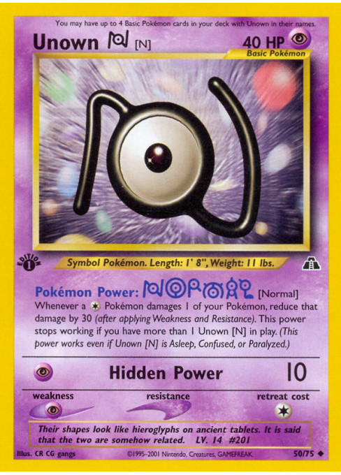 Whenever a Colorless Pokémon damages 1 of your Pokémon, reduce that damage by 30 (after applying Weakness and Resistance). This power stops working if you have more than 1 Unown [N] in play. (This power works even if Unown [N] is Asleep, Confused, or Paralyzed.)