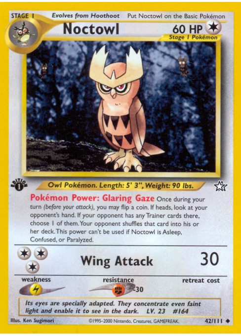 Once during your turn (before your attack), you may flip a coin. If heads, look at your opponent's hand. If your opponent has any Trainer cards there, choose 1 of them. Your opponent shuffles that card into his or her deck. This power can't be used if Noctowl is Asleep, Confused, or Paralyzed.