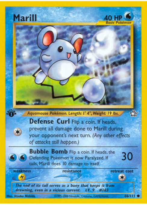 Flip a coin. If heads, the Defending Pokémon is now Paralyzed. If tails, Marill does 10 damage to itself.