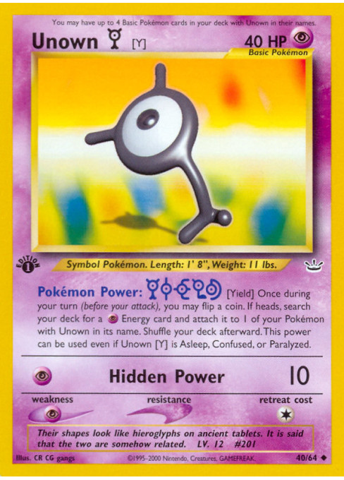 Once during your turn (before your attack), you may flip a coin. If heads, search your deck for a Psychic Energy card and attach it to 1 of your Pokémon with Unown in its name. Shuffle your deck afterward. This power can be used even if Unown [Y] is Asleep, Confused, or Paralyzed.