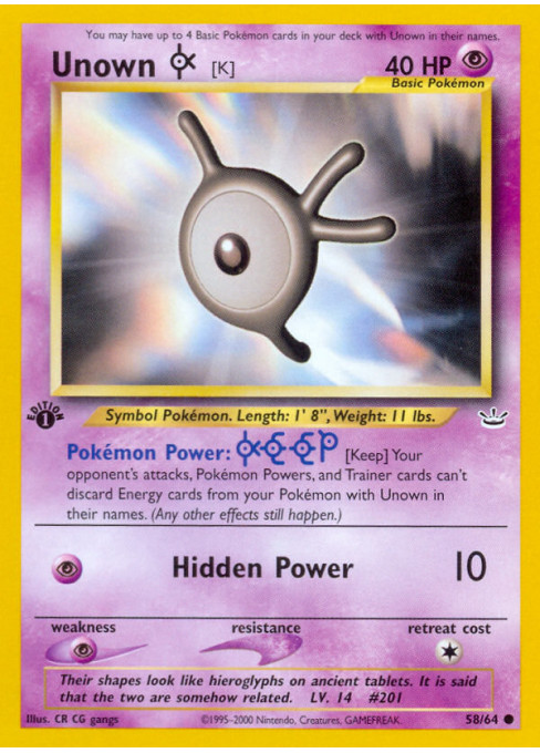Your opponent's attacks, Pokémon Powers, and Trainer cards can't discard Energy cards from your Pokémon with Unown in their names. (Any other effects still happen.)