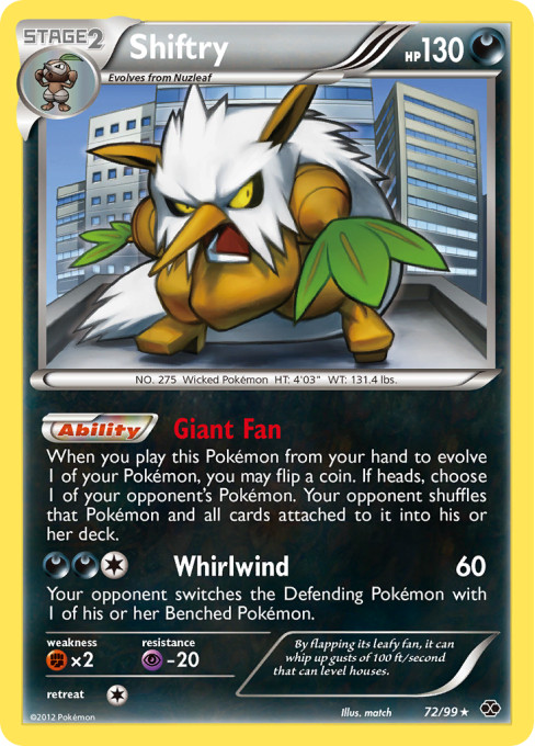 When you play this Pokémon from your hand to evolve 1 of your Pokémon, you may flip a coin. If heads, choose 1 of your opponent's Pokémon. Your opponent shuffles that Pokémon and all cards attached to it into his or her deck.