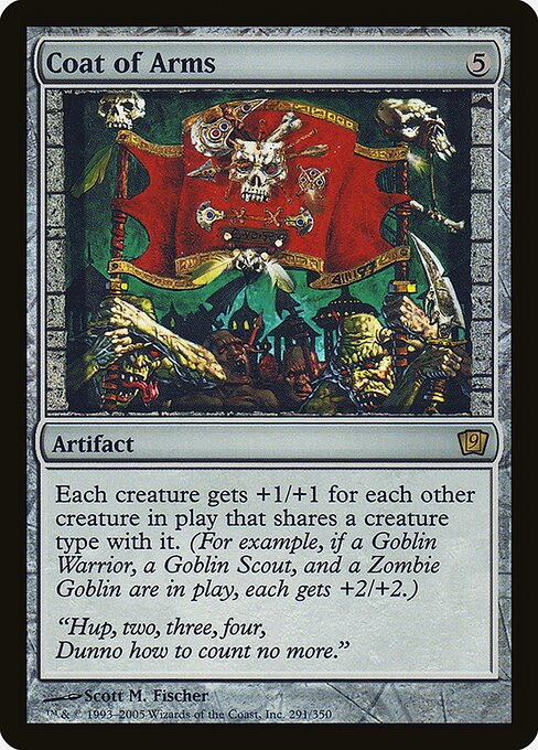 Each creature gets +1/+1 for each other creature on the battlefield that shares at least one creature type with it. (For example, if two Goblin Warriors and a Goblin Shaman are on the battlefield, each gets +2/+2.)