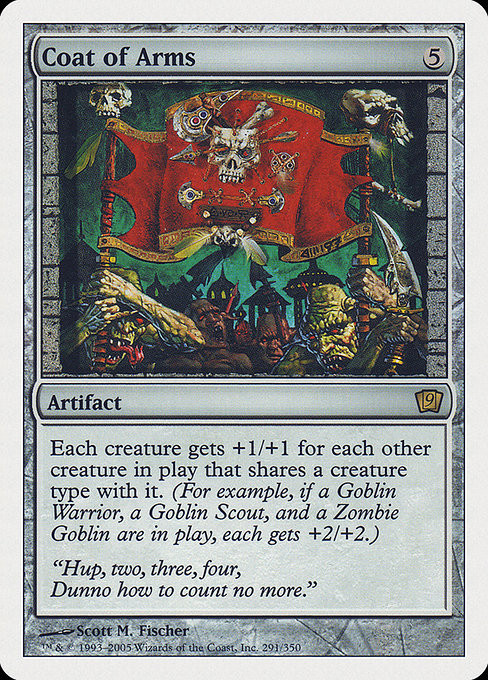 Each creature gets +1/+1 for each other creature on the battlefield that shares at least one creature type with it. (For example, if two Goblin Warriors and a Goblin Shaman are on the battlefield, each gets +2/+2.)