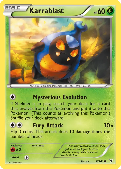 When they feel threatened, they spit acidic liquid to drive attackers away. This Pokémon targets Shelmet.