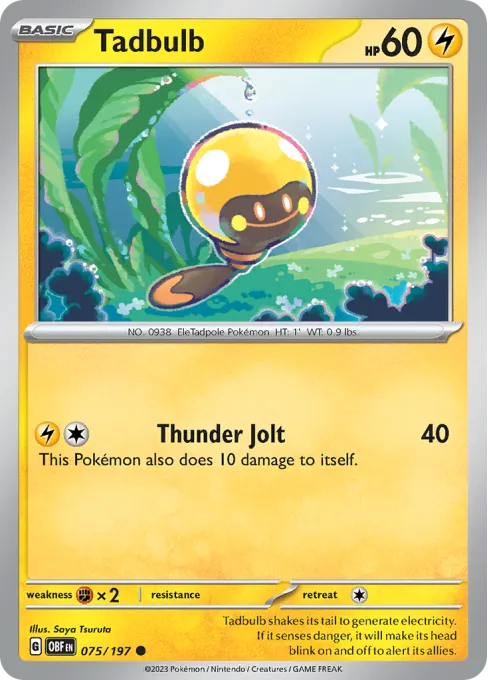 Tadbulb shakes its tail to generate electricity. If it senses danger, it will make its head blink on and off to alert its allies.