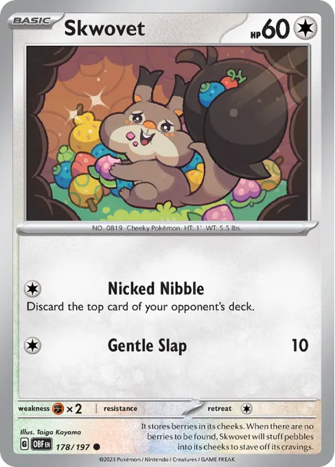 It stores berries in its cheeks. When there are no berries to be found, Skwovet will stuff pebbles into its cheeks to stave off its cravings.