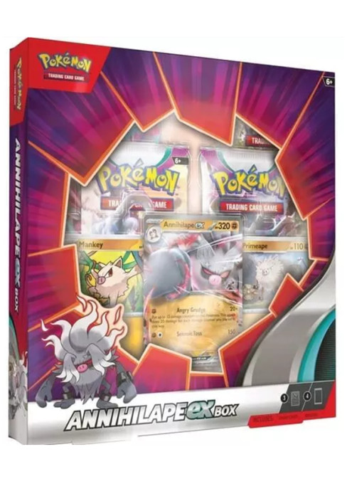 Pokémon Annihilape ex Box je dárkové balení hry Pokémon TCG, které nám představuje nový design ex Boxů. Sběratelům a hráčům umožní získat kartu Pokémona Annihilape ex a hned 4 doplňkové Booster balíčky. Od tohoto boxu nás opouštějí Jumbo karty, ale nejdete zde hned 2 promo karty - Mankey a Primeape. Díky tomu získáte celou vývojovou linii tohoto bojového Pokémona. Pokud hledáte balení s garantovanou Pokémon ex kartou a příp. i s celou vývojovou linií, která se hodí do většina herních balení, sáhněte po Annihilape ex boxu.
