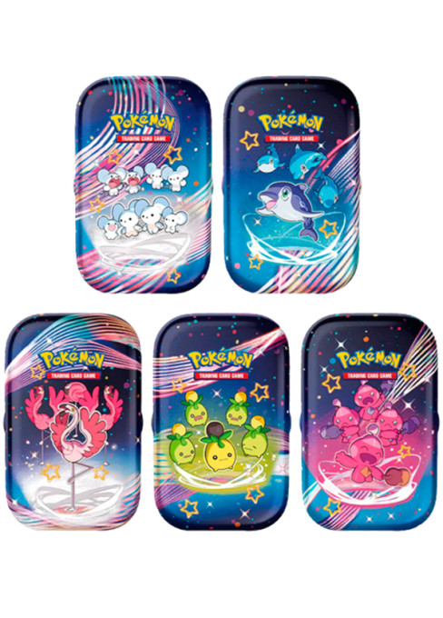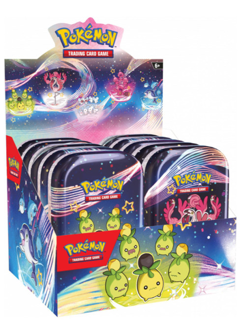 Paldean Fates Mini Tin je balení 2 boosterů Paldean Fates, samolepek a obrázkové karty. Jedná se o malý dárek, který potěší každého. Vše je uloženo v malé plechové krabičce, kde si můžete skladovat své karty.
