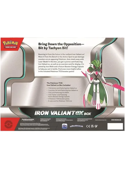 Pokémon Iron Valiant ex Box je speciální dárkové balení hry Pokémon TCG. Získejte promo karty Iron Valiant ex, Iron Moth a Future Booster Energy Capsule, velkou Jumbo kartu Iron Valiant ex a 4 booster balíčky. Pokud hledáte box, ve kterém máte zaručené karty psychického Pokémona, je tento pro vás ten pravý.