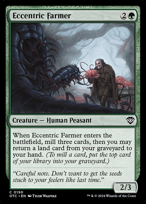 When Eccentric Farmer enters, mill three cards, then you may return a land card from your graveyard to your hand. (To mill a card, put the top card of your library into your graveyard.)