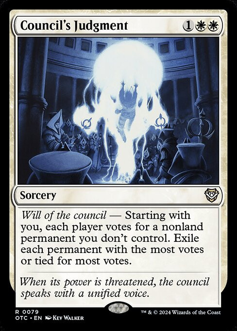 Will of the council — Starting with you, each player votes for a nonland permanent you don't control. Exile each permanent with the most votes or tied for most votes.
