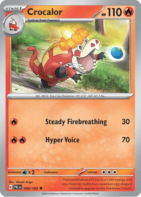 The combination of Crocalor's fire energy and overflowing vitality has caused an egg-shaped fireball to appear on the Pokémon's head.